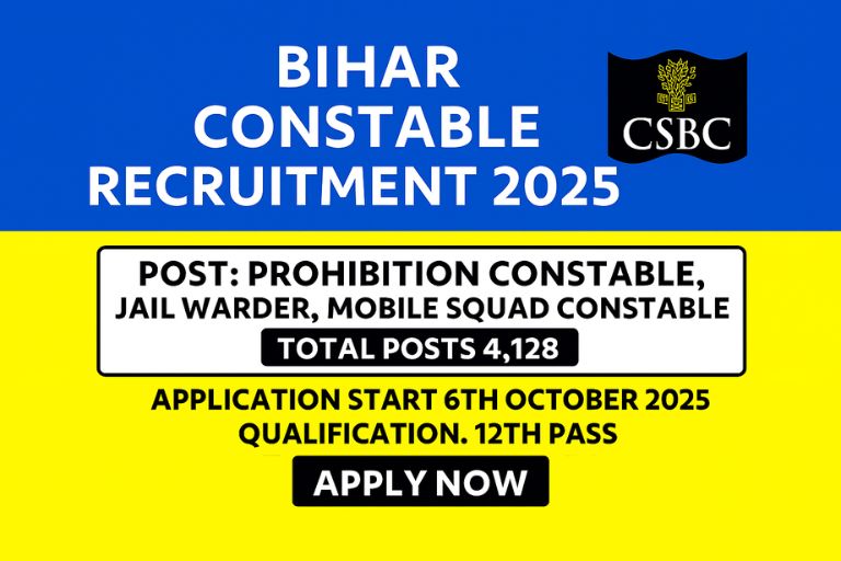 The Central Selection Board of Constable (CSBC), Bihar has officially released Advertisement No. 03/2025 for the recruitment of 4,128 Constable posts across multiple departments. These include the Prohibition, Excise & Registration Department, the Home (Prisons) Department for Jail Warder posts, and the Transport Department for Mobile Squad Constables. The online application process begins on 6th … Read more